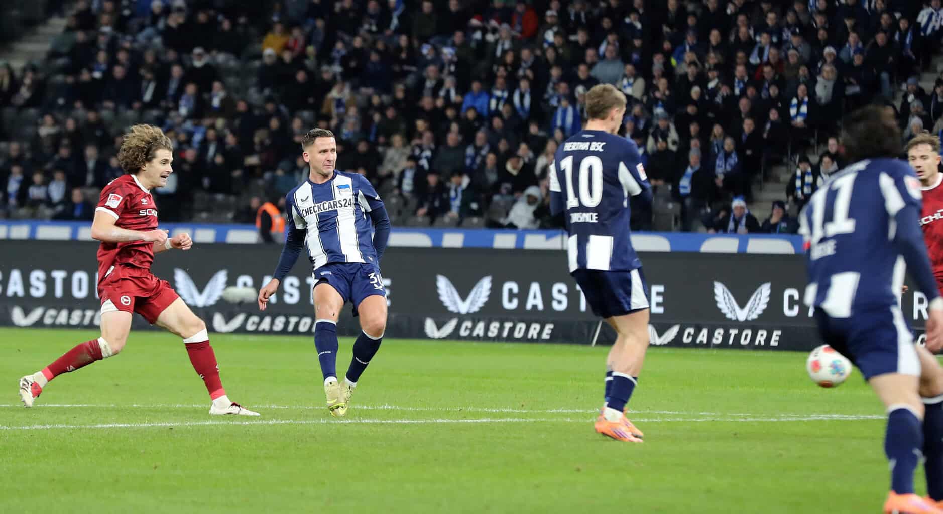 Ereignisarmer verlief das Geschehen im Olympiastadion. Hertha BSC war zwar mit mehr Spielanteilen ausgestattet, kreierte aber nur selten Gefahrenmomente. Nach einer knappen Viertelstunde verpasste der aufgerückte Verteidiger Linus Gechter aus halbrechter Position nur knapp das lange Eck. Ebenso fehlten Fabian Reese nur wenige Zentimeter. Dieser leitete auch die große Möglichkeit für Luca Schuler ein, der jedoch verstolperte.