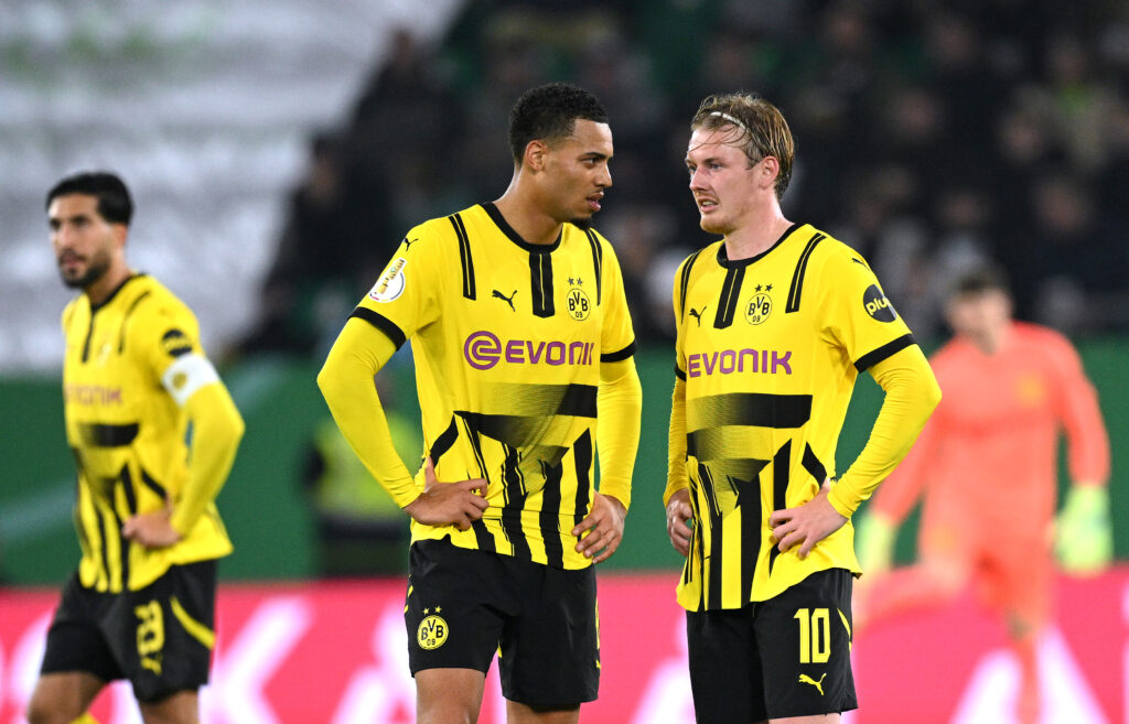 WOLFSBURG, GERMANY - OCTOBER 29: Felix Nmecha and Julian Brandt of Borussia Dortmund speak during the DFB-Pokal match between VfL Wolfsburg and Borussia Dortmund at Volkswagen Arena on October 29, 2024 in Wolfsburg, Germany. (Photo by Stuart Franklin/Getty Images)