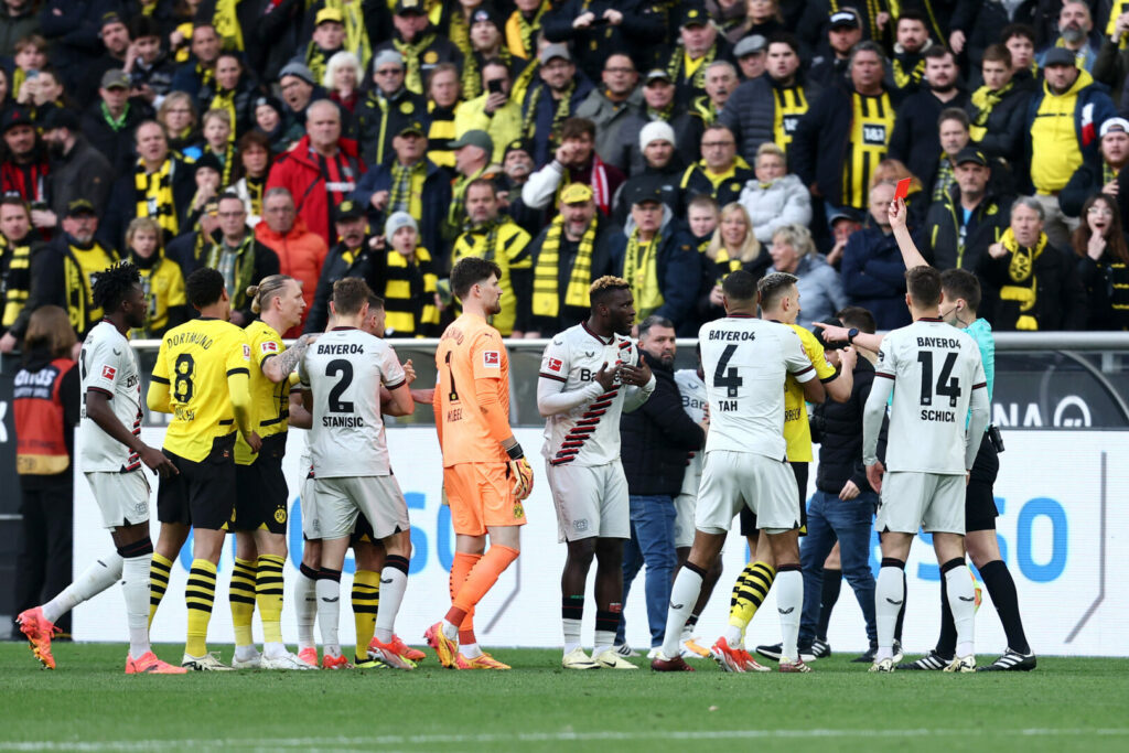 70 Minuten waren auf der Uhr, dann kam Florian Wirtz doch noch. Trotzdem tat sich nicht allzu viel. Bis zu 81. Minute, dann spielte sich der BVB mal über die rechte Seite durch, der Ball kam zu Füllkrug, der ihn direkt nahm. Der wuchtige Abschluss konnte von Hradecky nicht mehr entscheidend pariert werden, das 1:0 war die Folge. Dann wurde es unschön: Es kam zu Rangeleien auf dem Feld und zu einer Rudelbildung, Victor Boniface sah dabei die rote Karte, Frimpong und Nico Schlotterbeck kassierten die gelbe Karte. Nach Ansicht der Videobilder nahm der Schiedsrichter die rote Karte für Boniface zurück, zeigte Granit Xhaka in der Folge noch gelb. Als alles danach aussah, dass die Werkself jetzt verlieren würde, traf die Mannschaft von Xabi Alonso wieder. Josip Stanisic köpfte einen Eckball von der linken Seite in die lange Ecke. Das war der Schlusspunkt, Leverkusen bleibt ungeschlagen.