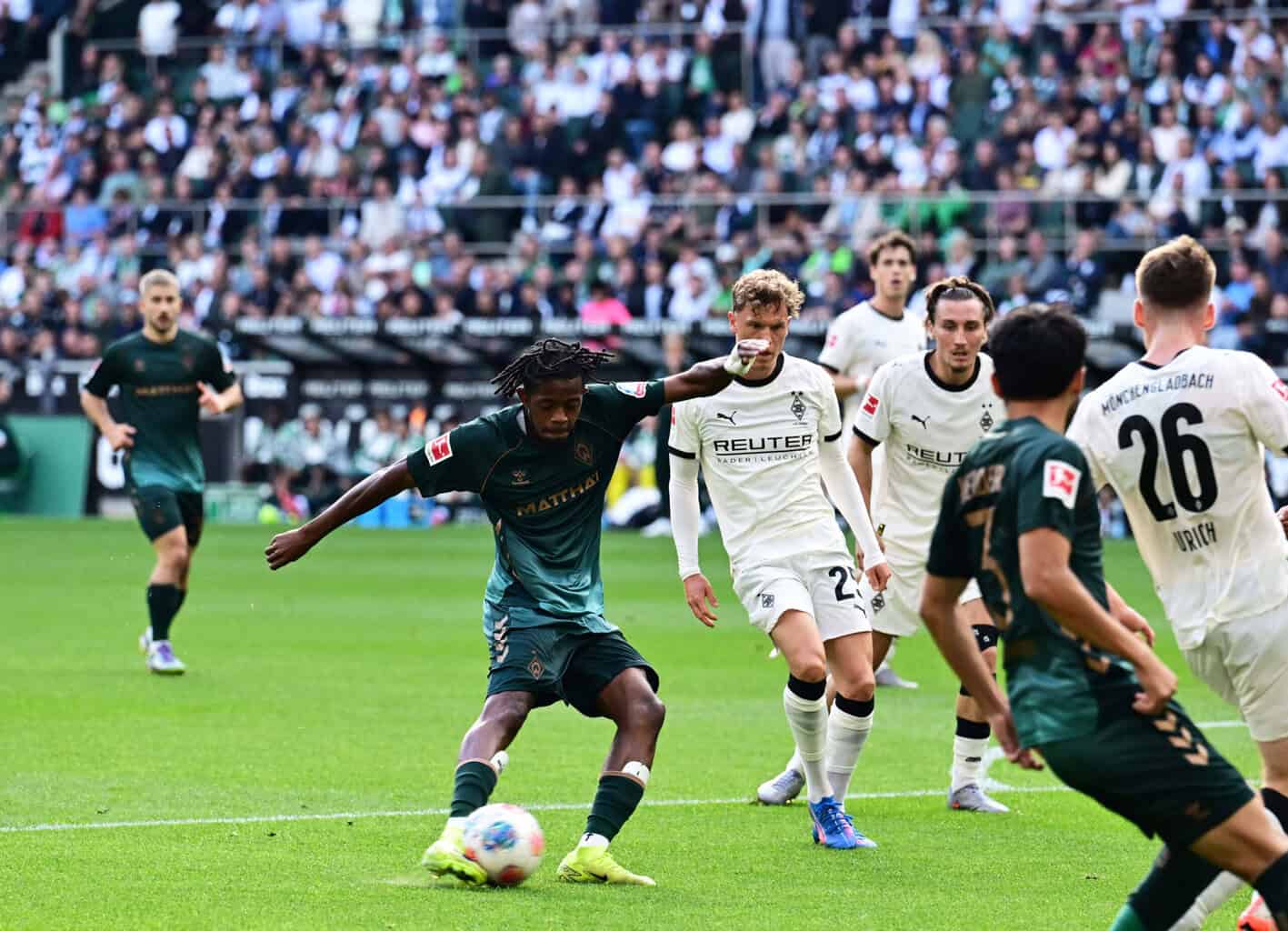 Die Anfangsphase der Partie gehörte der Borussia. Ein vermeintliches Handspiel von Coulibaly im Bremer Strafraum verursachte einen ersten Aufschrei, Referee Jöllenbeck sowie der VAR stellten aber keinen Regelverstoß fest (6.). Nach schönem Pass von Ullrich schoss Machino aus ungünstigem Winkel ans Außennetz, es war die bis dato beste Chance des Spiels (14.). Und fast im Gegenzug stellten die Gäste den bisherigen Spielverlauf auf den Kopf. Über rechts bekam Werder mal etwas Platz, Mbangula konnte unbedrängt in den Strafraum dribbeln und traf aus rund 15 Metern sehenswert mithilfe der Latte zum 0:1 (15.). Es war das erste Bundesliga-Tor des jungen Belgiers.