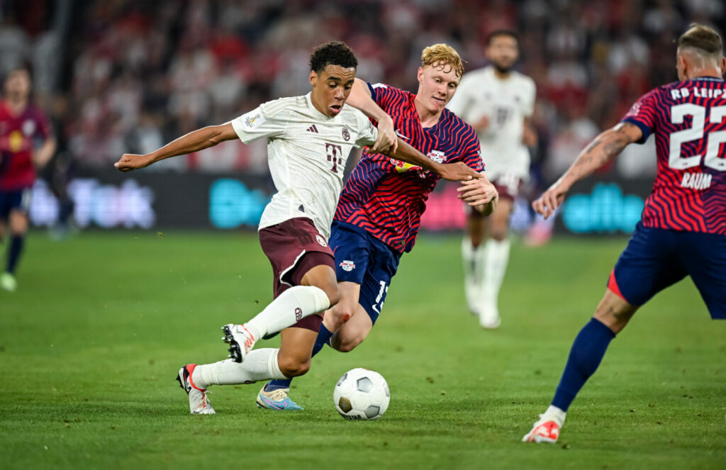 MUNICH, GERMANY - AUGUST 12: Jamal Musiala of FC Bayern München in action with Nicolas Seiwald of Leipzig during the DFL Supercup 2023 match between FC Bayern München and RB Leipzig at Allianz Arena on August 12, 2023 in Munich, Germany. (Photo by Daniel Kopatsch/Getty Images)