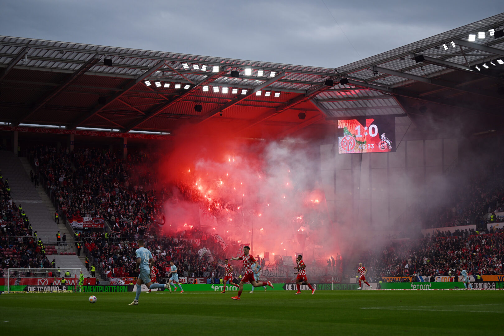 Mainz wurde geradliniger, Köln musste häufiger zu Fouls greifen, sodass sich sogar eine kleine Rudelbildung entwickelte. Das änderte aber nichts am Mainzer Oberwasser. Nach 28 Minuten ging es dann mal schnell: Köln spielte einen Freistoß schwach aus, Mainz schaltete schnell um. Amiri bediente Karim Onisiwo mit einem Ball in den Lauf, der schloss ab, aber Schwäbe konnte parieren. Allerdings kam der Ball genau vor die Füße von Leandro Barreiro, der dann zur Führung für die 05er traf.