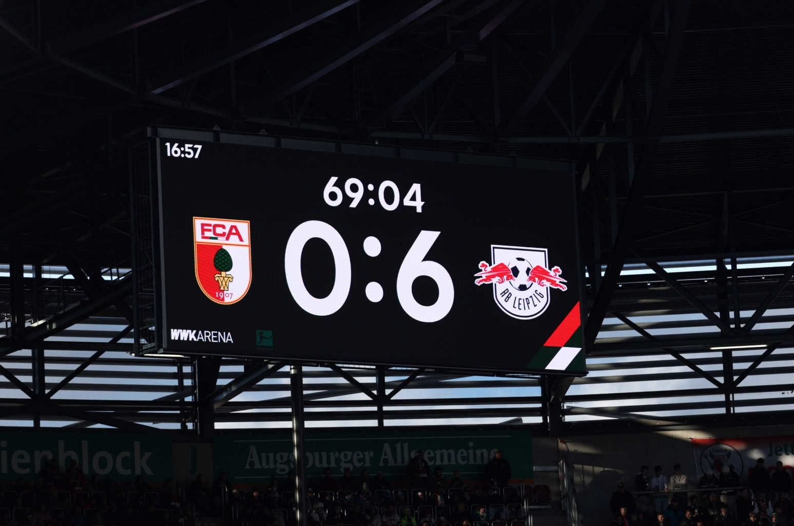 Die Anzeigetafel zeigt ein 0:6 zwischen dem FC Augsburg und RB Leipzig