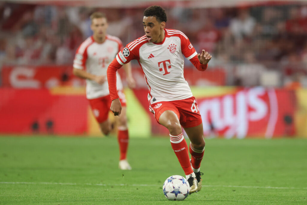 MUNICH, GERMANY - SEPTEMBER 20: Jamal Musiala of Bayern Munich controls the ball during the UEFA Champions League match between FC Bayern München and Manchester United at Allianz Arena on September 20, 2023 in Munich, Germany. (Photo by Alex Grimm/Getty Images)