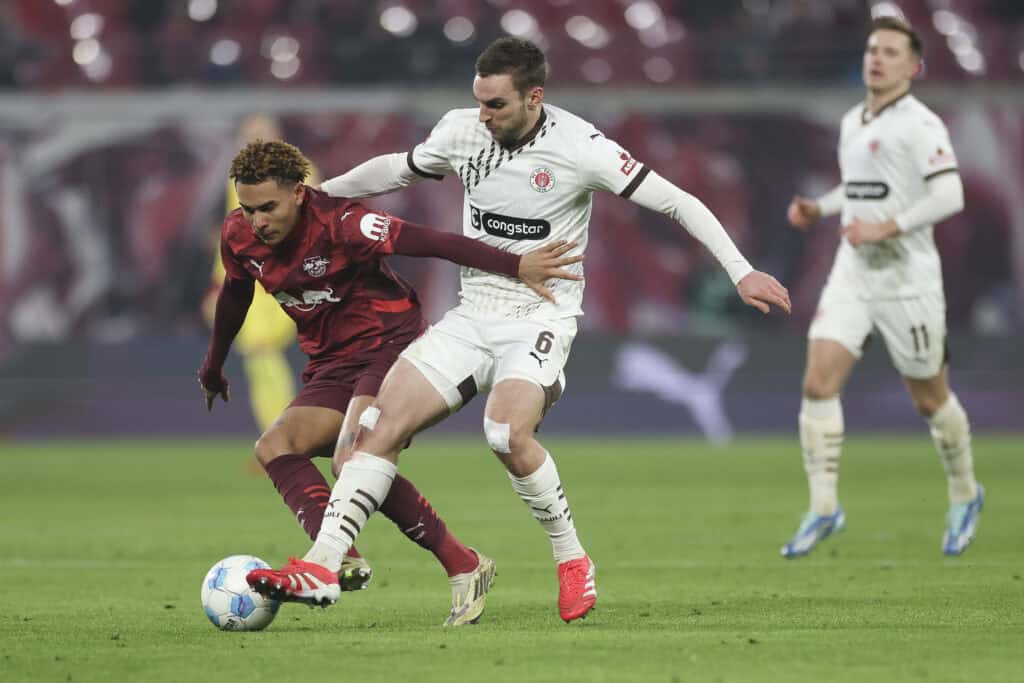 LEIPZIG, GERMANY - FEBRUARY 09: James Sands of FC St. Pauli battles for possession with Antonio Nusa of RB Leipzig during the Bundesliga match between RB Leipzig and FC St. Pauli 1910 at Red Bull Arena on February 09, 2025 in Leipzig, Germany. (Photo by Maja Hitij/Getty Images)