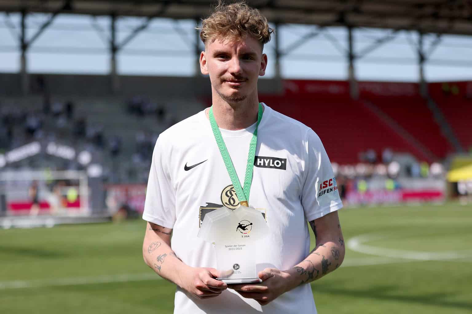 Woltemade mit der Trophäe „Spieler der Saison“ nach dem letzten Saisonspiel in Ingolstadt (Photo by Jasmin Walter/Getty Images for DFB)