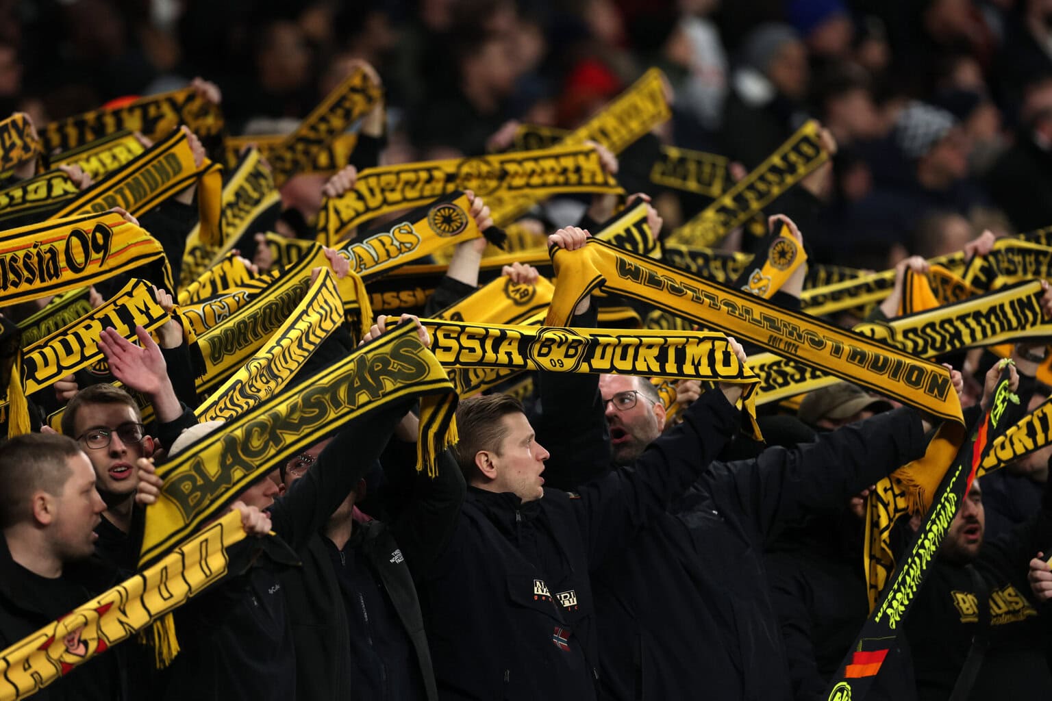 Fans von Borussia Dortmund halten ihre Schals hoch