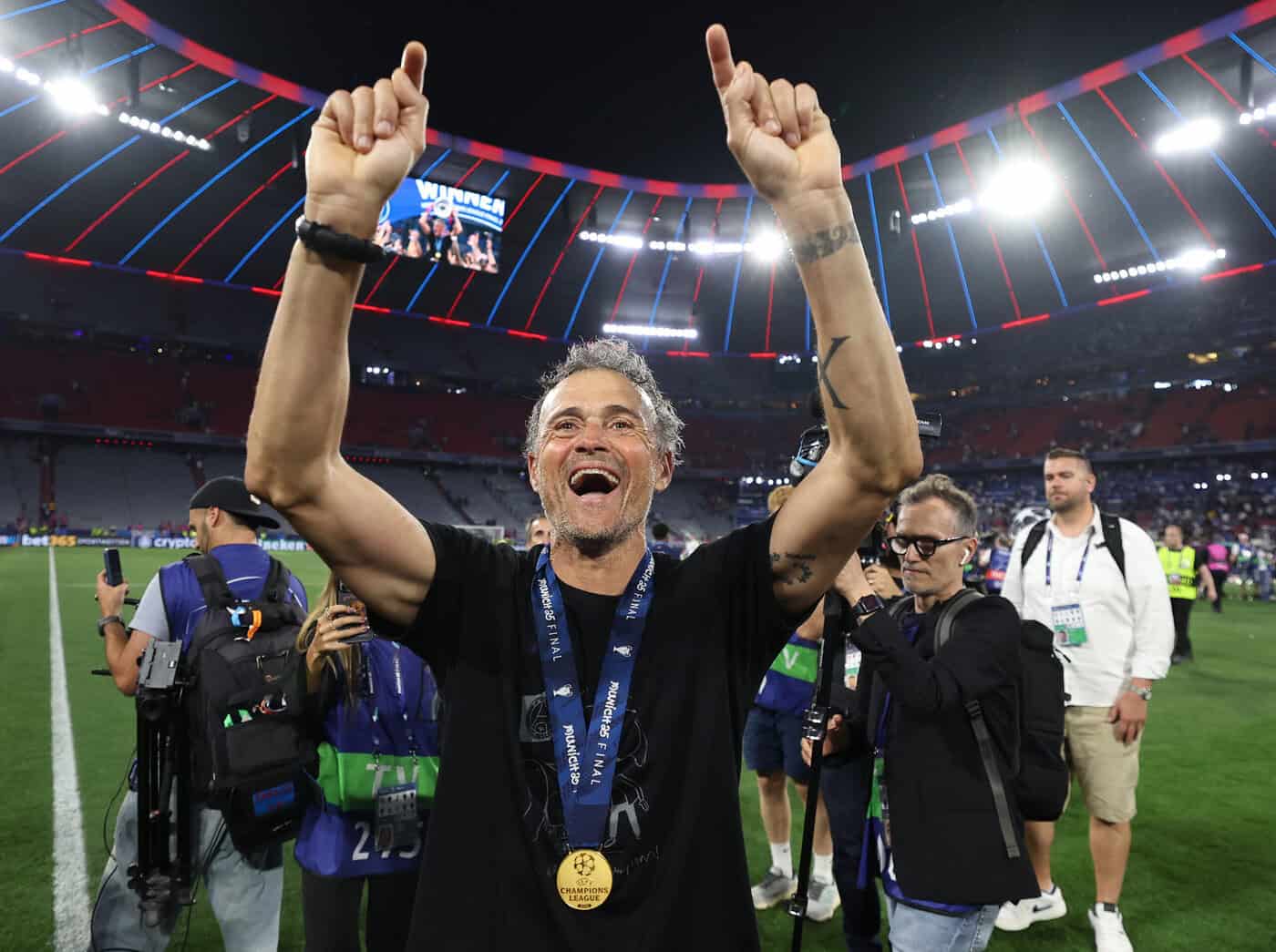 Für den Spanier war der historische Erfolg besonders emotional: Das Kunststück Triple gelang dem 55-Jährigen vor zehn Jahren schon einmal mit dem FC Barcelona. Damals feierte er den Triumph mit seiner seiner kleinen Tochter Xana, zusammen steckten sie eine Barca-Fahne in den Rasen des Berliner Olympiastadions. 2019 starb Xana im Alter von nur neun Jahren an den Folgen von Knochenkrebs. Den Triumph mit PSG widmete Enrique daher seiner verstorbenen Tochter, von den Fans gab es dazu ein rührendes Banner. „Xana ist immer bei uns“, sagte Enrique im Interview beim ZDF. „Ich denke, dass sie hier unter uns rennen würde, es ist ein wunderbarer Gedanke und schön, es auch mit der Familie und den Freunden zu teilen.“