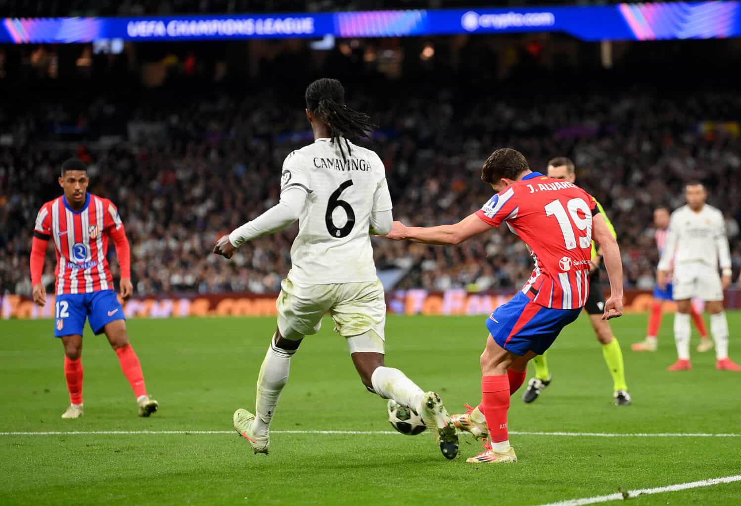 Nach 27 Minuten wurde es dann erstmals richtig gefährlich für das Tor von Thibaut Courtois. Nach einer scharfen Flanke von der rechten Seite klärte Valverde zunächst stark vor Samuel Lino, im Anschluss schoß Pablo Barrios aus der Distanz knapp am Tor vorbei. Auf der Gegenseite verpasste Rüdiger eine Freistoßflanke von Rodrygo knapp, so konnte Oblak zur Seite abwehren. In der 32. Minute schlug Atletico dann praktisch aus dem Nichts zum 1:1-Ausgleich zu. Alvarez erhielt den Ball auf der linken Seite von Galan. Camavinga kam nicht richtig in den Zweikampf und dann machte es Alvarez noch schöner als Rodrygo zuvor. Mit viel Effet zirkelte er den Ball vom linken Strafraumeck genau ins rechte Eck. Courtois war geschlagen.