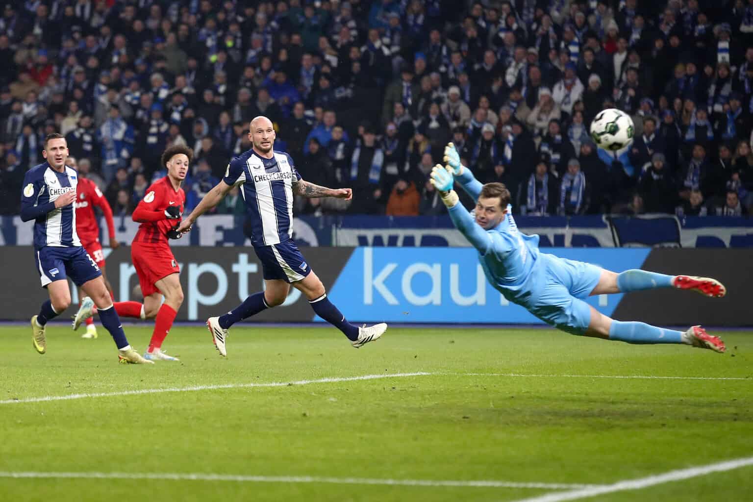 Hertha BSC empfing den SC Freiburg im Pokal-Viertelfinale. Nach interessantem Start neutralisierten sich beide Teams und es ging in die Verlängerung. Dort glich Fabian Reese per Traumtor die Freiburger Führung aus, sodass die Entscheidung vom Punkt fallen musste. Am Ende wurde der Freiburger Pokalkeeper zum Helden.