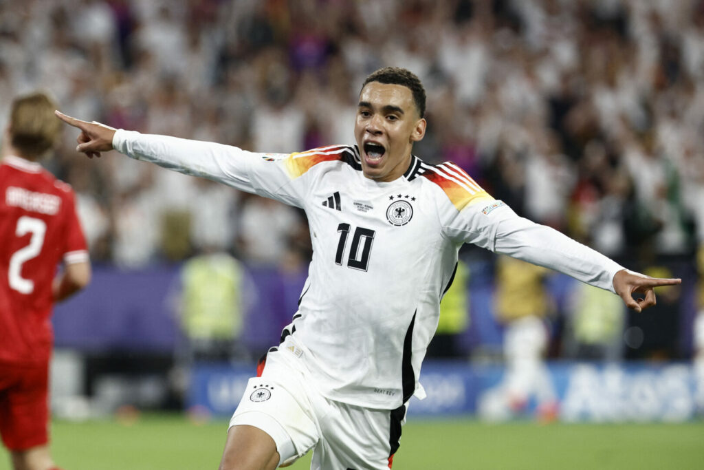 TOPSHOT - Germany's midfielder #10 Jamal Musiala celebrates scoring his team's second goal during the UEFA Euro 2024 round of 16 football match between Germany and Denmark at the BVB Stadion Dortmund in Dortmund on June 29, 2024. (Photo by KENZO TRIBOUILLARD / AFP) (Photo by KENZO TRIBOUILLARD/AFP via Getty Images)
