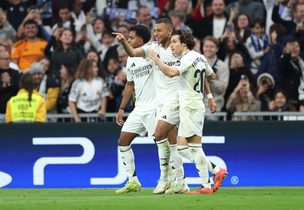 MADRID, SPAIN - DECEMBER 01: Kylian Mbappe of Real Madrid celebrates scoring his team's second goal with Rodrygo and Fran Garcia during the LaLiga match between Real Madrid CF and Getafe CF at Estadio Santiago Bernabeu on December 01, 2024 in Madrid, Spain. (Photo by Florencia Tan Jun/Getty Images)