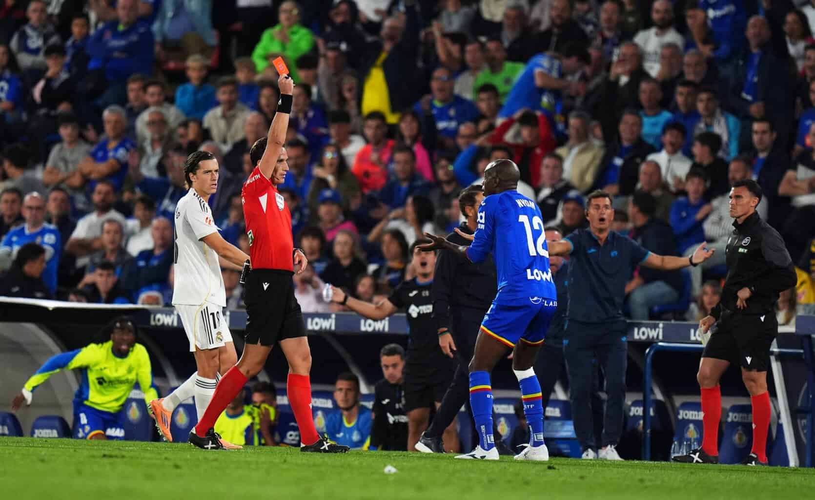 Mbappé beförderte auch einen Freistoß aus 18 Metern knapp neben das Tor, wobei Eder Militär noch leicht abfälschte (73.). Derweil schaffte Getafe kaum noch Entlastung. Der Fokus lag nahezu ausschließlich auf der Abwehrarbeit. Trainer Bordalas vollzog seinen ersten Wechsel erst in Minute 76, welcher direkt Konsequenzen besaß. Denn der frisch gekommene Allan-Romeo Nyom rammte Vinícius Júnior abseits des Balls um und sah die Rote Karte.