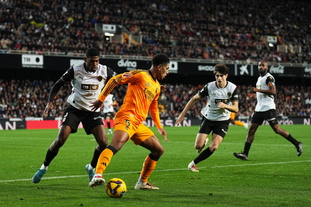 VALENCIA, SPAIN - JANUARY 03: Jude Bellingham of Real Madrid controls the ball whilst under pressure from Cristhian Mosquera of Valencia CF during the LaLiga match between Valencia CF and Real Madrid CF at Estadio Mestalla on January 03, 2025 in Valencia, Spain. (Photo by Aitor Alcalde/Getty Images)