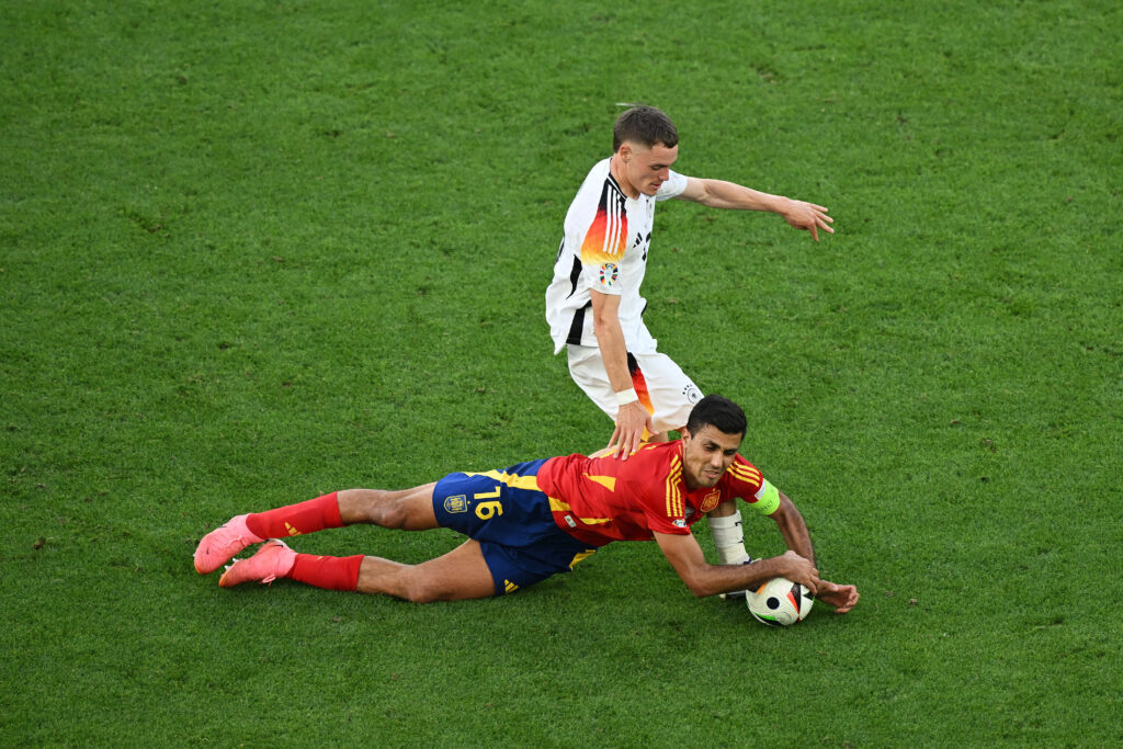 STUTTGART, GERMANY - JULY 05: Rodri of Spain is challenged by Florian Wirtz of Germany during the UEFA EURO 2024 quarter-final match between Spain and Germany at Stuttgart Arena on July 05, 2024 in Stuttgart, Germany. (Photo by Clive Mason/Getty Images)
