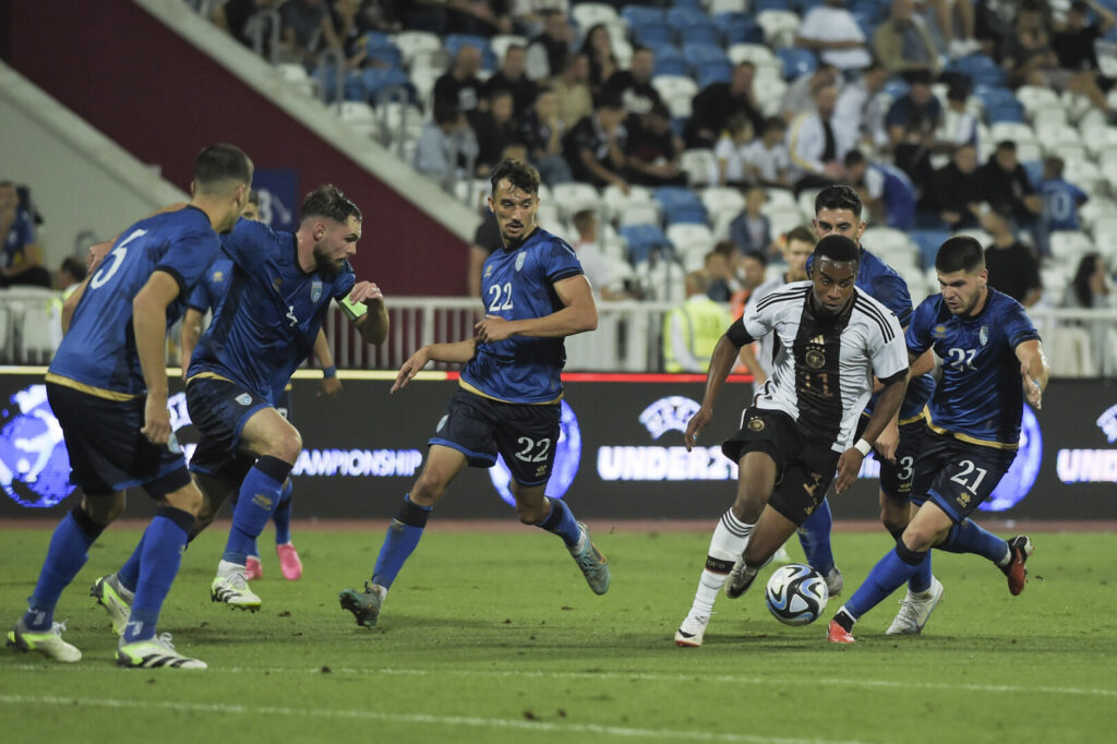 Eine flache Hereingabe von Ansgar Knauff wurde abgefangen und führte im Gegenzug zur ersten deutschen Ecke des Spiels. Diese geriet dem Frankfurter anschließend jedoch deutlich zu hoch (18.). Kurz darauf versuchte es Knauff erneut über links, wurde aber wegen einer Abseitsposition zurückgepfiffen (20.). Deutschland blieb praktisch durchgehend am Ball, während die kosovarischen Akteure sich hauptsächlich auf ihre Defensivarbeit konzentrierten. Klare Torchancen ließen beidseitig auf sich warten. Moukoko versuchte es aus der Distanz, verfehlte das gegnerische Gehäuse jedoch (27.).
