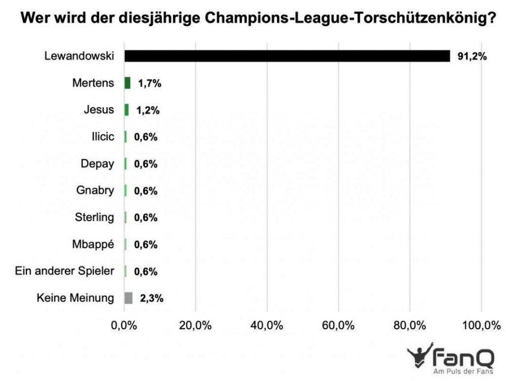 Der beste Torschütze der Champions League wird nach Ansicht der Befragten ebenfalls aus München kommen. Das deutliche Ergebnis zu Gunsten von Robert Lewandowski ist nachvollziehbar. Der 31-Jährige führt die Königsklasse mit elf erzielten Toren an. Dries Mertens, Serge Gnabry (beide sechs Tore), Kylian Mbappé, Mauro Icardi, Raheem Sterling, Gabriel Jesus, Memphis Depay und Josip Iličić (allesamt fünf) sind von den noch teilnehmenden Teams die nächstbesten Schützen. Der zweiterfolgreichste Torjäger, Erling Haaland (zehn Tore), ist mit Borussia Dortmund bereits ausgeschieden.
