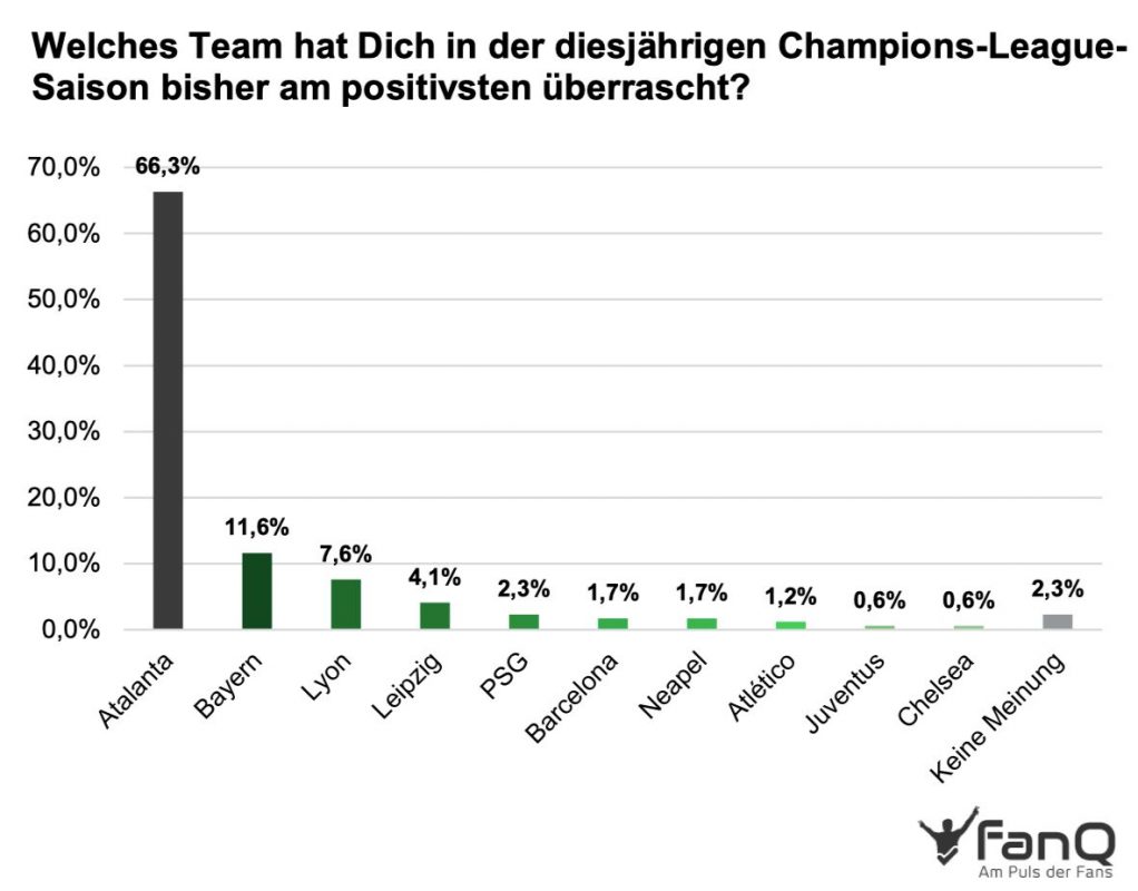 Als wir auf den bisherigen Turnierverlauf der Champions League blickten, stellte sich Atalanta BC als eine der positiven Überraschungen heraus. In der Serie A wurde die Mannschaft von Gian Piero Gasperini Dritter, scheiterte nur knapp an der 100-Tore-Marke. Und auch in der Königsklasse setzte Atalanta Akzente, überlebte eine Gruppe mit Manchester City und bezwang im Achtelfinale den FC Valencia. Für 66 Prozent der Befragten sind die Italiener schon jetzt das Überraschungsteam der Champions-League-Saison, egal was im Viertelfinale gegen Paris Saint-Germain auch passiert.