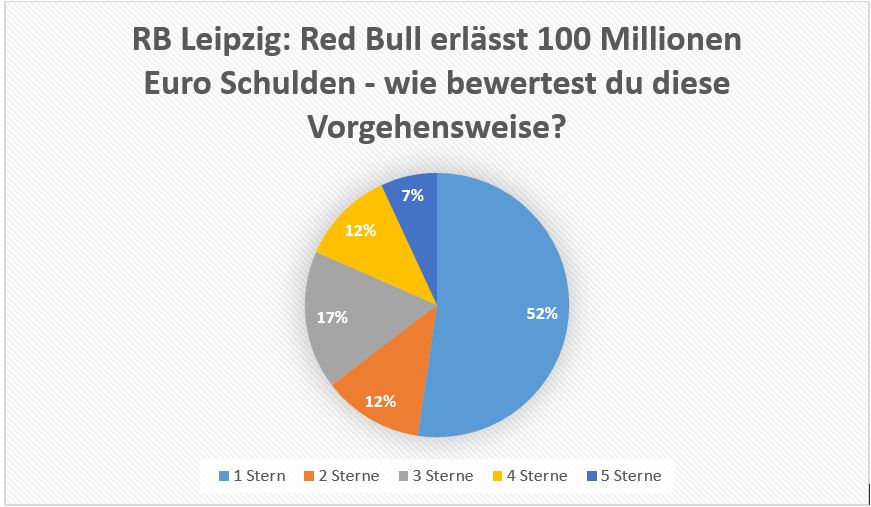 Trotzdem sehen die FanQ-User diesen Vorgang extrem kritisch. Danach gefragt, wie sie die die Vorgehensweise von RB bewerten, antworteten 52,3 Prozent mit nur einem von möglichen fünf Sternen. Der Durchschnittswert liegt hier bei 2,08 Sternen.