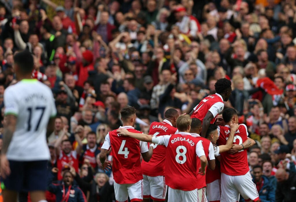 Arsenal übernahm von Beginn an das Heft des Handelns, die Spurs wurden schnell ins eigene Drittel gedrängt. Nach einer unzureichend geklärten Flanke kam Gabriel Martinelli zum ersten Abschluss, aus spitzem Winkel lenkte Hugo Lloris im Tor der Gäste den Flachschuss an den Außenpfosten (3.). Aus dem Nichts hatten dann die Spurs die erste ganz große Gelegenheit des Spiels. Nach einem Freistoß kam Richarlison frei an den Ball, doch Aaron Ramsdale war zur Stelle und kratzte den Ball aus dem Eck (13.). Auf der Gegenseite verzog Granit Xhaka aus der Distanz knapp (17.).
