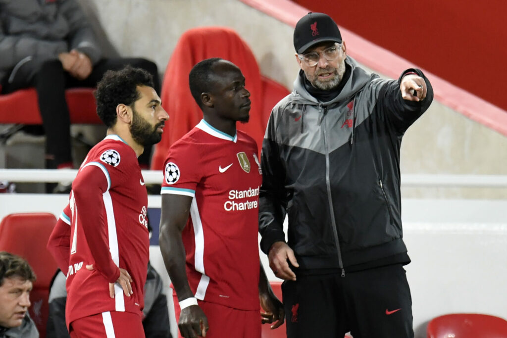 Liverpool's German manager Jurgen Klopp (R) speaks with Liverpool's Senegalese striker Sadio Mane (C) and Liverpool's Egyptian midfielder Mohamed Salah (L) as they prepare to come on as substitutes during the UEFA Champions league Group D football match between Liverpool and Midtjylland at Anfield in Liverpool, north west England on October 27, 2020. (Photo by PETER POWELL / POOL / AFP) (Photo by PETER POWELL/POOL/AFP via Getty Images)