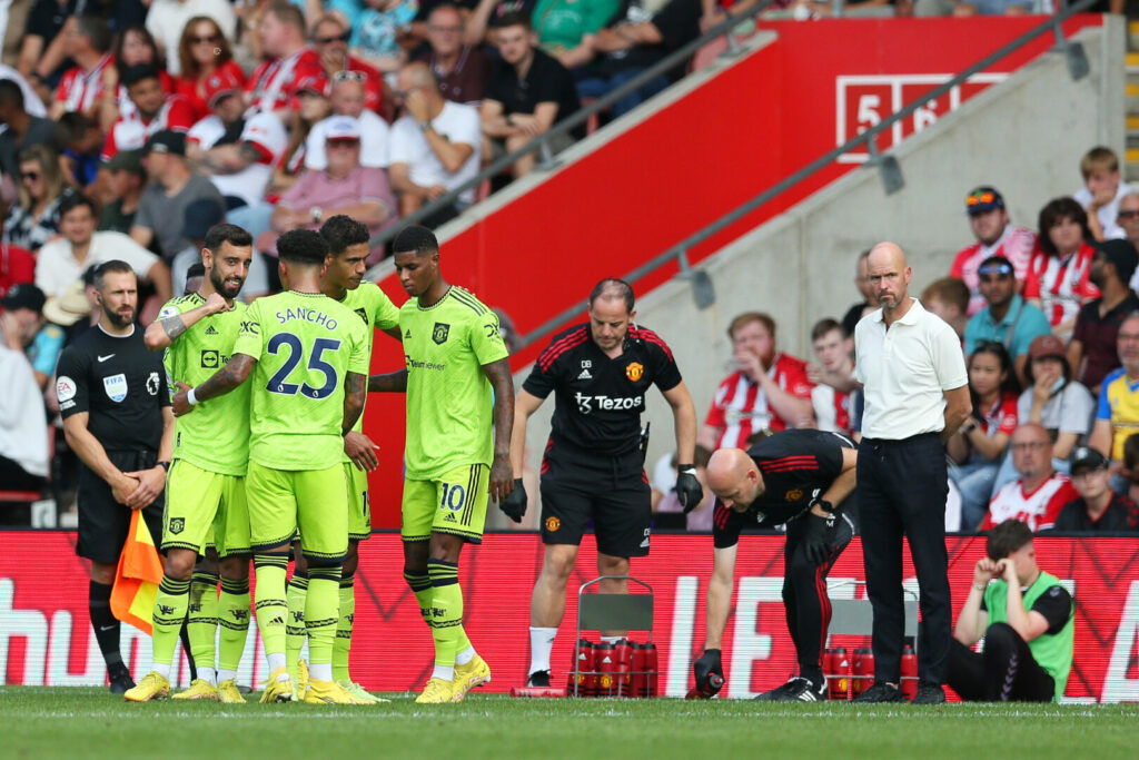 Southampton spielte typischen Hasenhüttl-Fußball: Von der ersten Minute an ein kompaktes und hochaggressives Mittelfeldpressing, garniert mit konsequentem Gegenpressing über den gesamten Platz. Mit Ball lag der Fokus auf langen Bällen, Kontern und Tiefenläufen. Damit steckten sie Manchester United an, die in den ersten zehn Minuten mehr Ballbesitzanteile hatten. Raphael Varane und Lisandro Martinez versuchten immer wieder, den Block von Southampton mit langen Bällen zu überspielen. Diese waren aber zu ungenau. Gefährliche Situationen gab es kaum und wenn, wurden sie fast immer vom dribbelwütigen Jadon Sancho initiiert.
