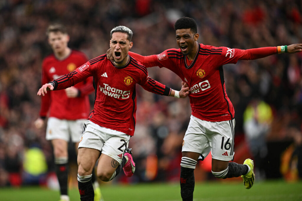 Manchester United's Brazilian midfielder #21 Antony (L) celebrates with Manchester United's Ivorian midfielder #16 Amad Diallo (R) after scoring their second goal during the English FA Cup Quarter Final football match between Manchester United and Liverpool at Old Trafford in Manchester, north west England, on March 17, 2024. (Photo by Paul ELLIS / AFP) / RESTRICTED TO EDITORIAL USE. No use with unauthorized audio, video, data, fixture lists, club/league logos or 'live' services. Online in-match use limited to 120 images. An additional 40 images may be used in extra time. No video emulation. Social media in-match use limited to 120 images. An additional 40 images may be used in extra time. No use in betting publications, games or single club/league/player publications. / (Photo by PAUL ELLIS/AFP via Getty Images)