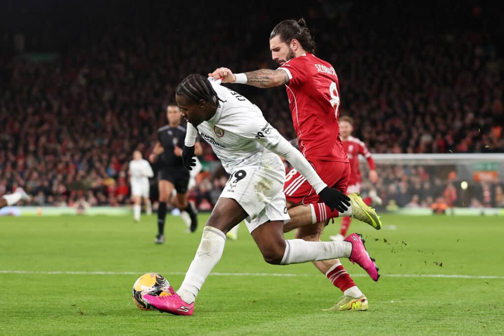 Die Gäste besitzen eine besondere Verbindung zur Anfield Road. Ihre letzten beiden Pflichtspiele gewannen sie dort nämlich (1997 in der Premier League, 2008 im FA-Cup). Auch diesmal legten sie couragiert los und wären schon nach 30 Sekunden fast in Führung gegangen. Eine Flanke von Adam Phillips wuchtete Davis Keillor-Dunn per Kopf an den Pfosten. Der erste LFC-Abschluss landete dagegen direkt im Netz: Dominik Szoboszlai hämmerte die Kugel traumhaft aus der Distanz ins linke obere Eck – 1:0 (9.).