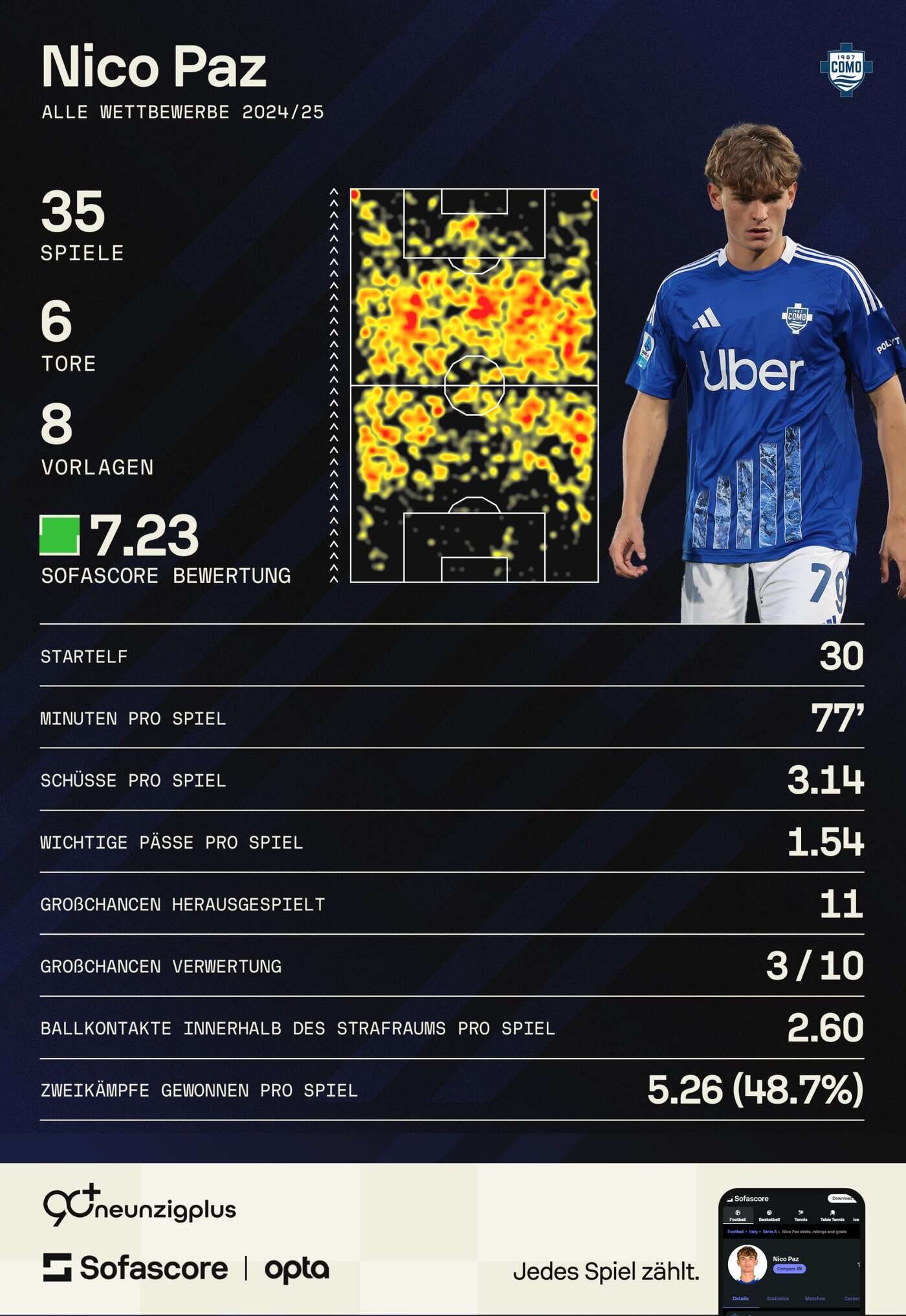 Wie die Sport BILD berichtet, ist Paz aktuell „der heißeste Kandidat“ für die Wirtz-Nachfolge. Der 20-jährige Argentinier mit spanischem Pass wechselte vergangenen Sommer von Real Madrid zum Serie-A-Klub Como 1907, wo er unter der Leitung von Cesc Fàbregas überzeugte: In 35 Pflichtspielen erzielte Paz sechs Tore und bereitete neun Treffer vor.